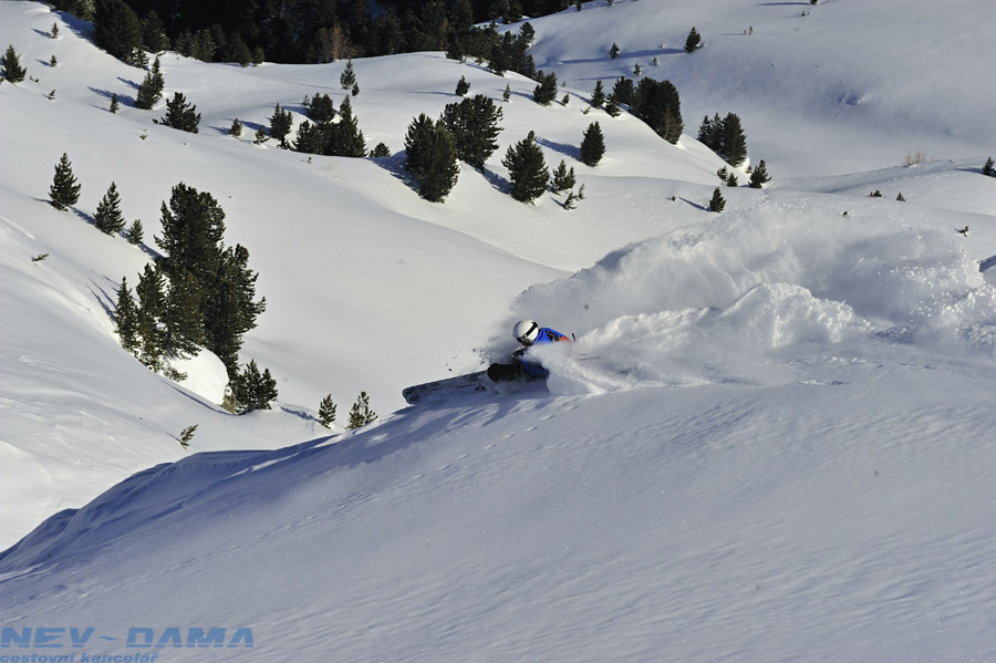 Zastavujeme u menších hřebínků, kde jeden byl nasvětlený sluncem, dáváme na něm pár oblouků a mně se ho povedlo vysypat. Věděli jsme, že svah je viditelný i z 3km vzdálené sjezdovky a tak se snažíme co nejdříve dostat do lesa. Při přibližování ke sjezdovce už vidím, jak si to ke mně míří místní policie, křičím na ostatní a dávám plný levý a za 3 sekundy jsem pryč v lese. Ostatní, hlavně Sláva, pochopil situaci a už ho drželi za ruku. Po krátké diskuzi jedou všichni na místní policejní stanici, která je u dolní stanice. Po kontrole fotek z foťáku a mého zapírání se musím dobrovolně ke skupině přidat. Nastává 3hod anabáze, odjíždíme s pokutou 50e na osobu a společnou fotkou.