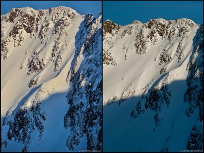 Ranní nástup na 10 nás překvapil čerstvým powderem i na parkáči , a tak v plném očekávání dáváme další den v super sněhu, který se sem tam připomene krustičem. Tak to pokračuje další den až do neděle, kdy si vybírám menší dropík, který se stal pro mě osudným. Rentalové vázko mě nekompromisně vyslalo do kotrmelců. Jedna z lyží se rozhodla vyrazit později a cca po 20 m mě trefuje do levého žebra, které to nedalo a zlomilo se (následné info z rengenu). Fidel hecuje "Jeremy Jones" hike a nikdo se dobrovolně nehlási. Takže s ním musím jít já. Dávám 3 brufeny 400 a šlapeme po čtyřech na lajnu, kterou tady vidíte na levé straně. Za tu námahu to rozhodně stálo I když "Jeremy" nasadil pekelné tempo a "Xavier" měl problem ho stíhat.