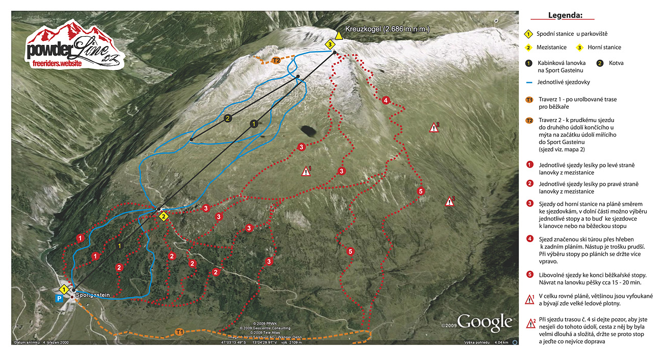 But the next days we were discovering the other side of the centre and that are big downhills to Mautstelle (toss gate). The first day we didn't want to, because we didn't know where do those trails lead and how would we get back to the centre. But after looking for every bus trail we discovered that near the toss gate there's a bus stop and there goes every approximately every 30 – 45 minutes a bus up. After precise examination how does the whole valley look in 3D Google Earth map we scheduled a few downhills and we really looking forward to the next day. After getting uphill by the cableway we put skis on, did necessary avalanche prevention by controlling our beacons and went to the other side of the centre. By traverse we get above a huge plain heading down. It’s really long ride down with high elevation and incredible possibilities. It’s not here churned up right away like in other centres because we do this ride down 3 or 4 times a day and even though there ride more people, it’s not anything wholesale. In the lower part you must avoid rough stream and choose some nice ride down through the forest up to the forest way, which takes you to the toss gate and the bus stop.